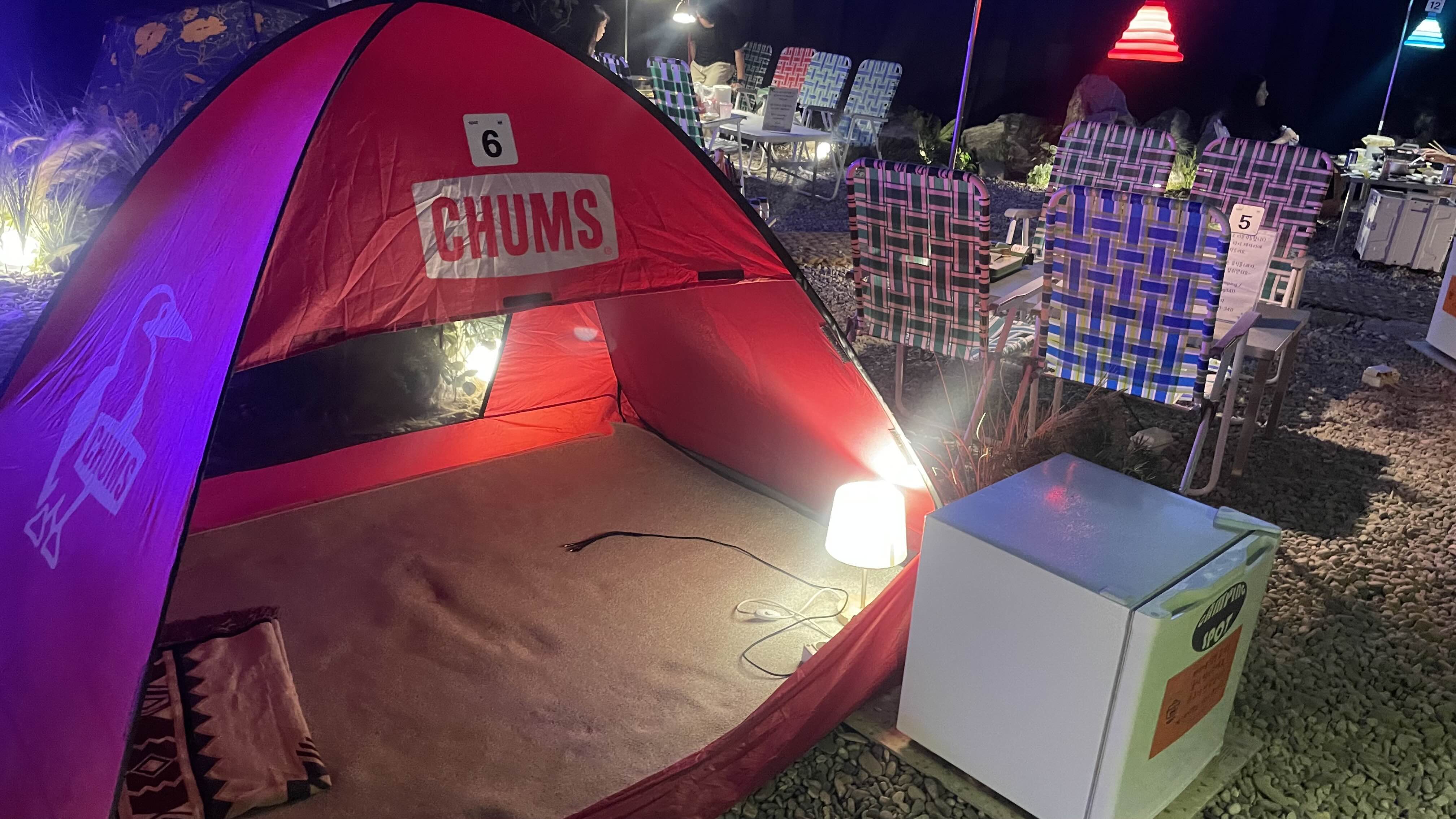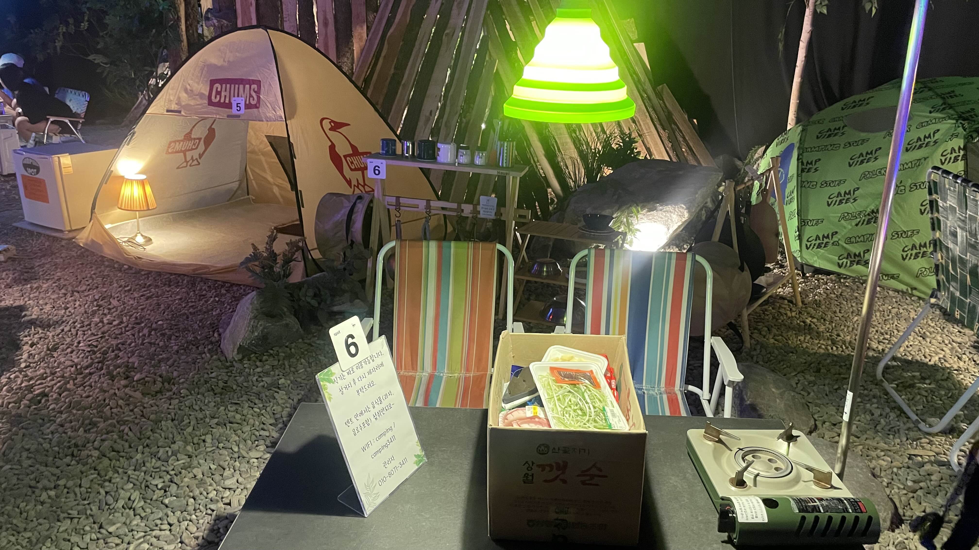 테이블 옆쪽엔 텐트와 냉장고도 있어요